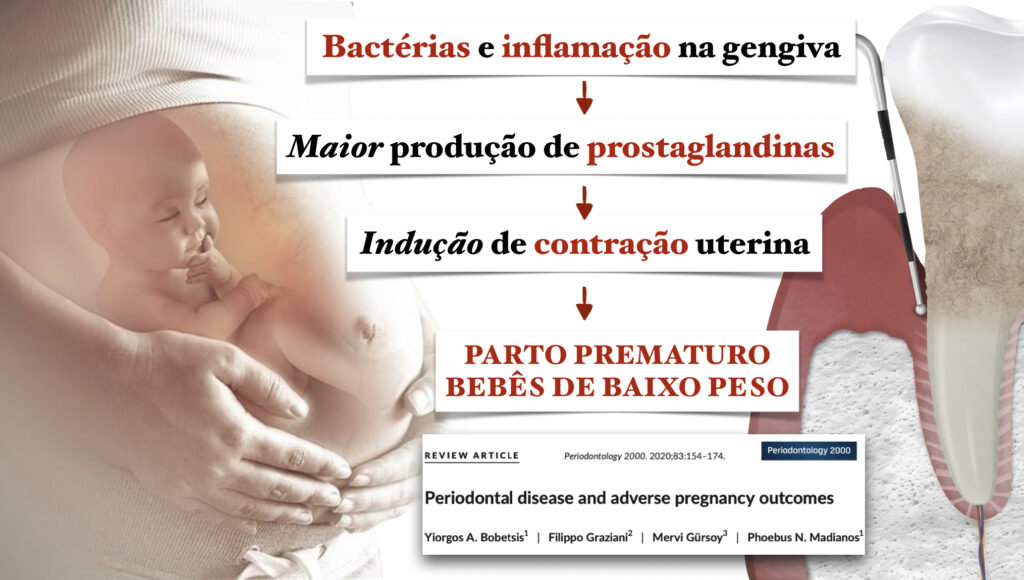 E assim como a gravidez afeta a gengiva, a presença de bactérias na gengiva também pode afetar a saúde sistêmica da gestante. E isso acontece porque como os vasos sanguíneos da gengiva estão mais dilatados, a entrada de bactérias na corrente sanguínea será maior. A presença de bactérias estimula a produção de citocinas pró-inflamatórias e prostaglandinas, que é responsável por induzir a contração uterina e isso pode levar a um parto prematuro e o nascimento de bebês de baixo peso.